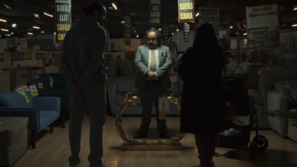 The film opens with recent parents Jesus (David Pareja) and Maria (Estefanía de los Santos) purchasing a garish coffee table from an unscrupulous salesman (Eduardo Antuña) who guarantees it will bring them happiness. The couple’s already troubled relationship is further strained by Jesus’ absolute insistence on purchasing it which Maria begrudgingly acquiesces to. After setting up the new table at home Jesus is left alone with the baby while Maria goes to the store and their lives are forever changed when an off-screen accident involving the new table ends up…..decapitating the infant child. The rest of the runtime is devoted Jesus’ emotional hell as he tries to conceal the fact from Maria for as long as he can that the worst possible thing has happened while she was gone.